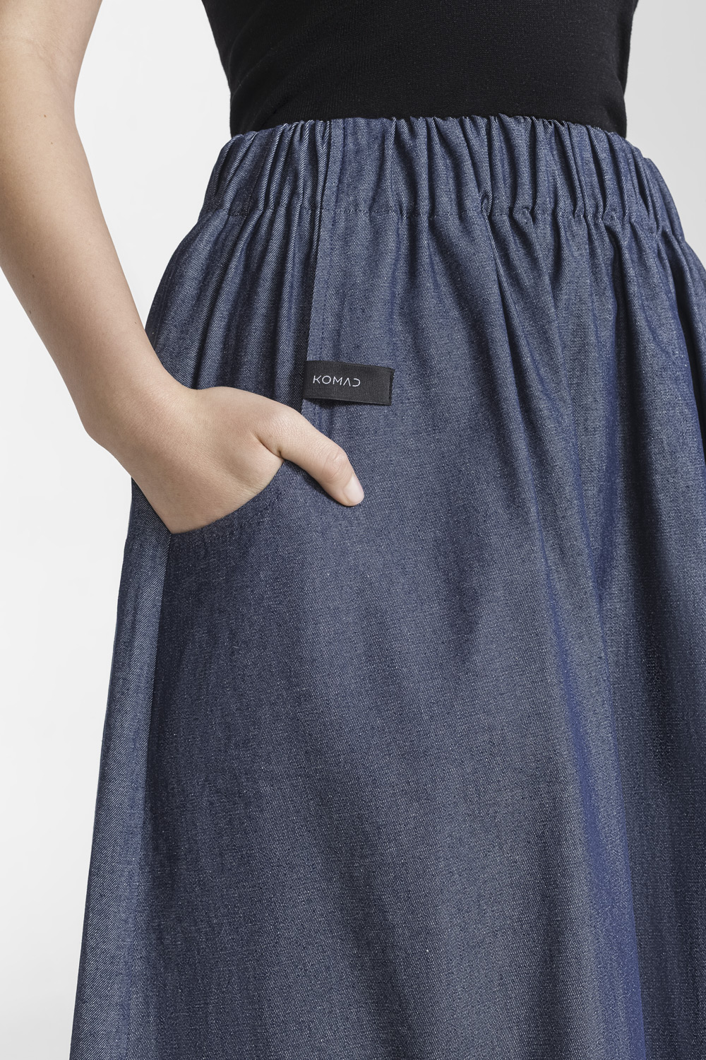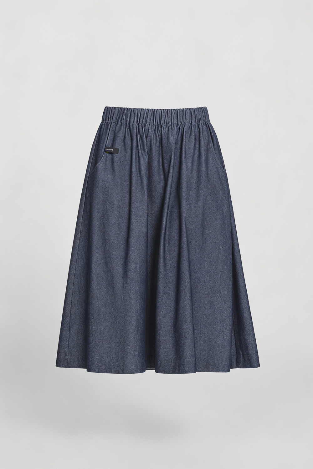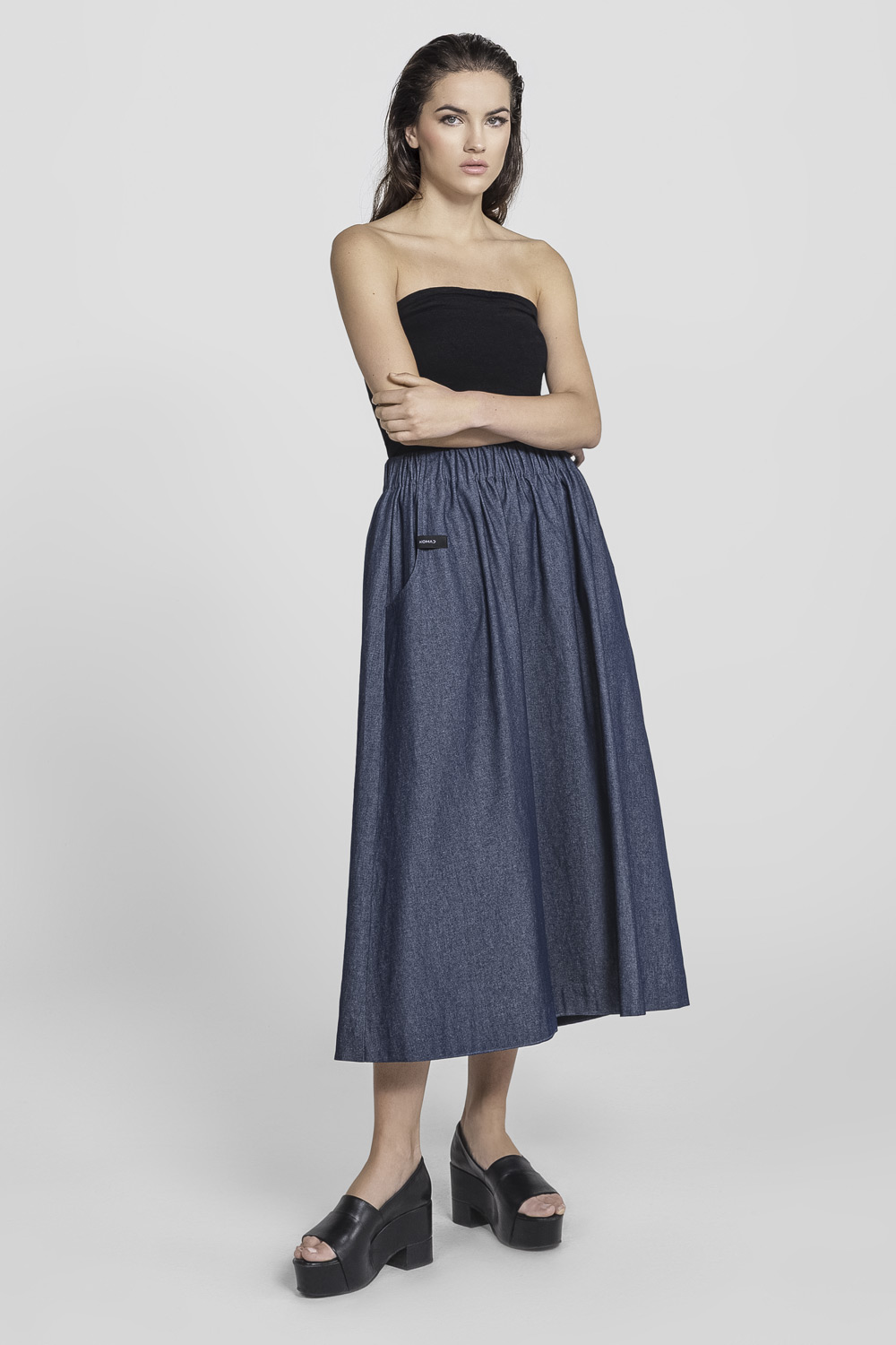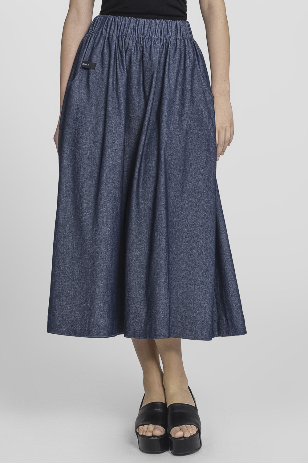 FLOW is mid-length skirt with voluminous A-line silhouette. It features an elasticated waistband and two pockets on the side.