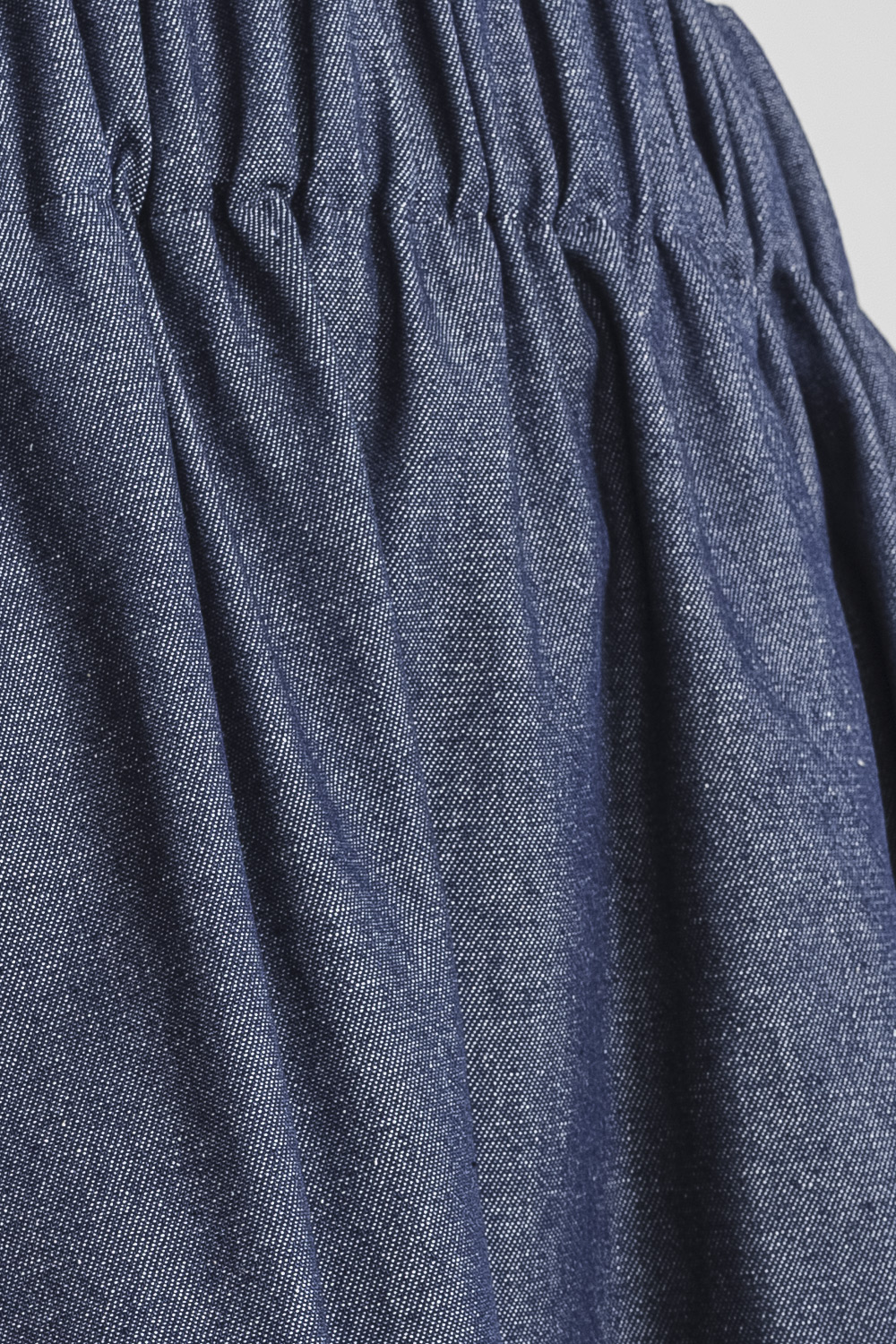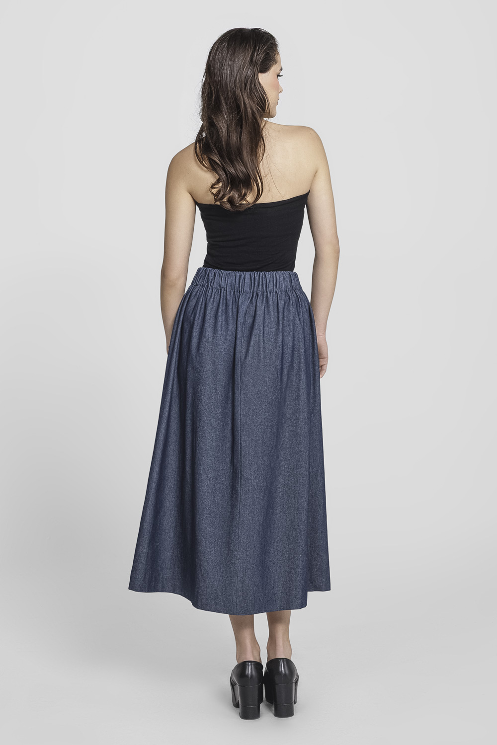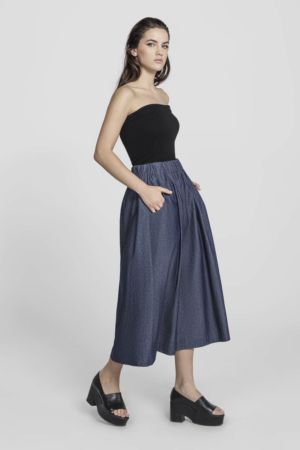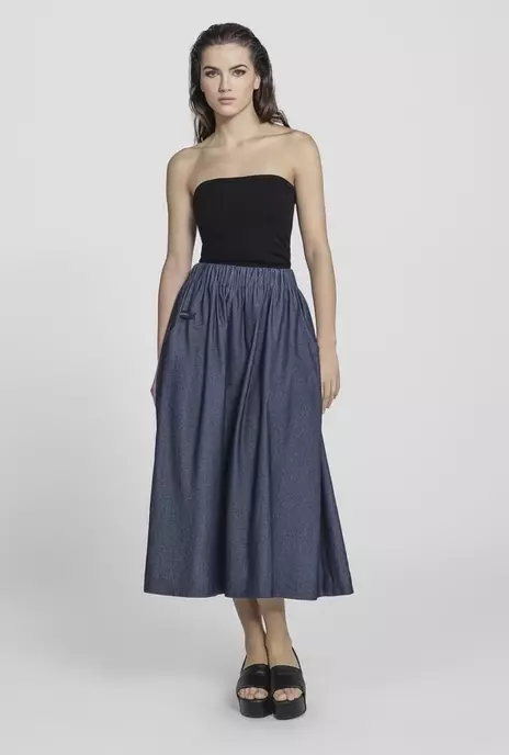 FLOW is mid-length skirt with voluminous A-line silhouette. It features an elasticated waistband and two pockets on the side.