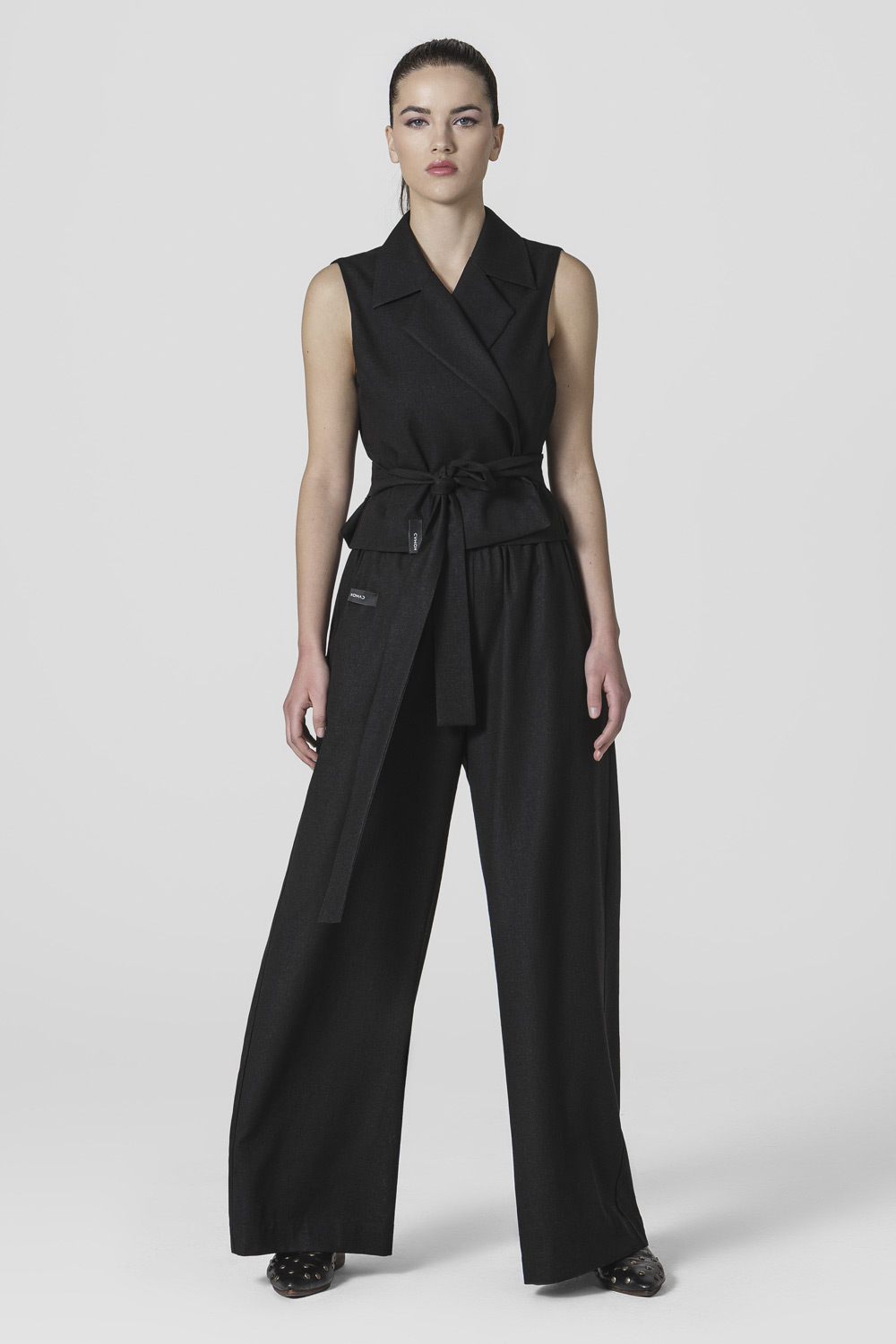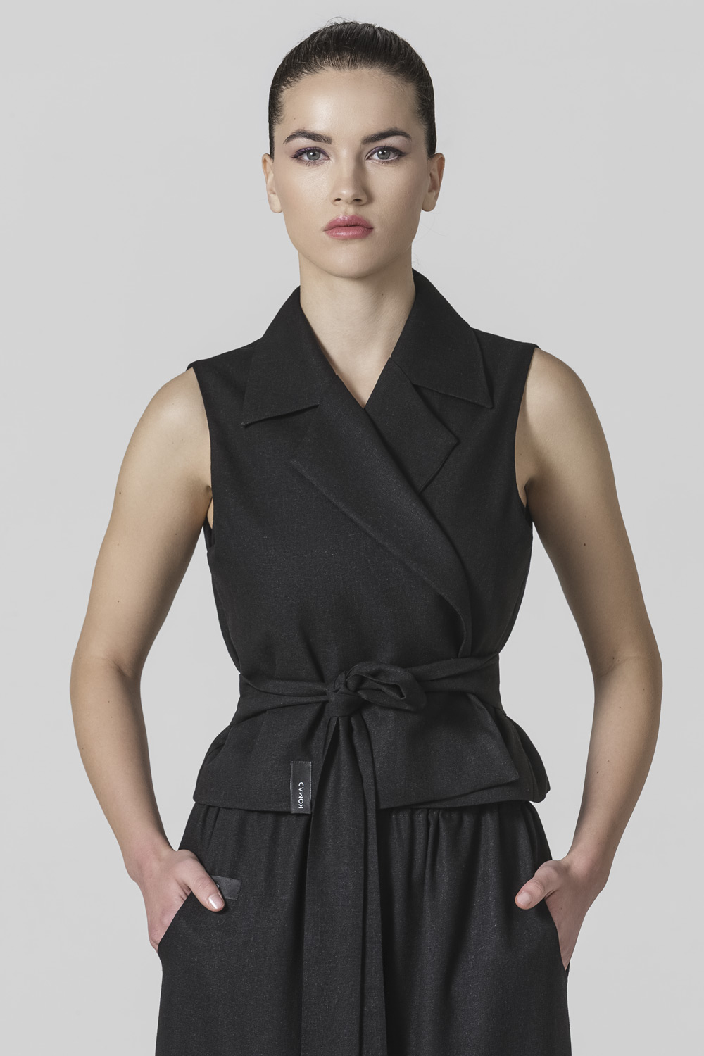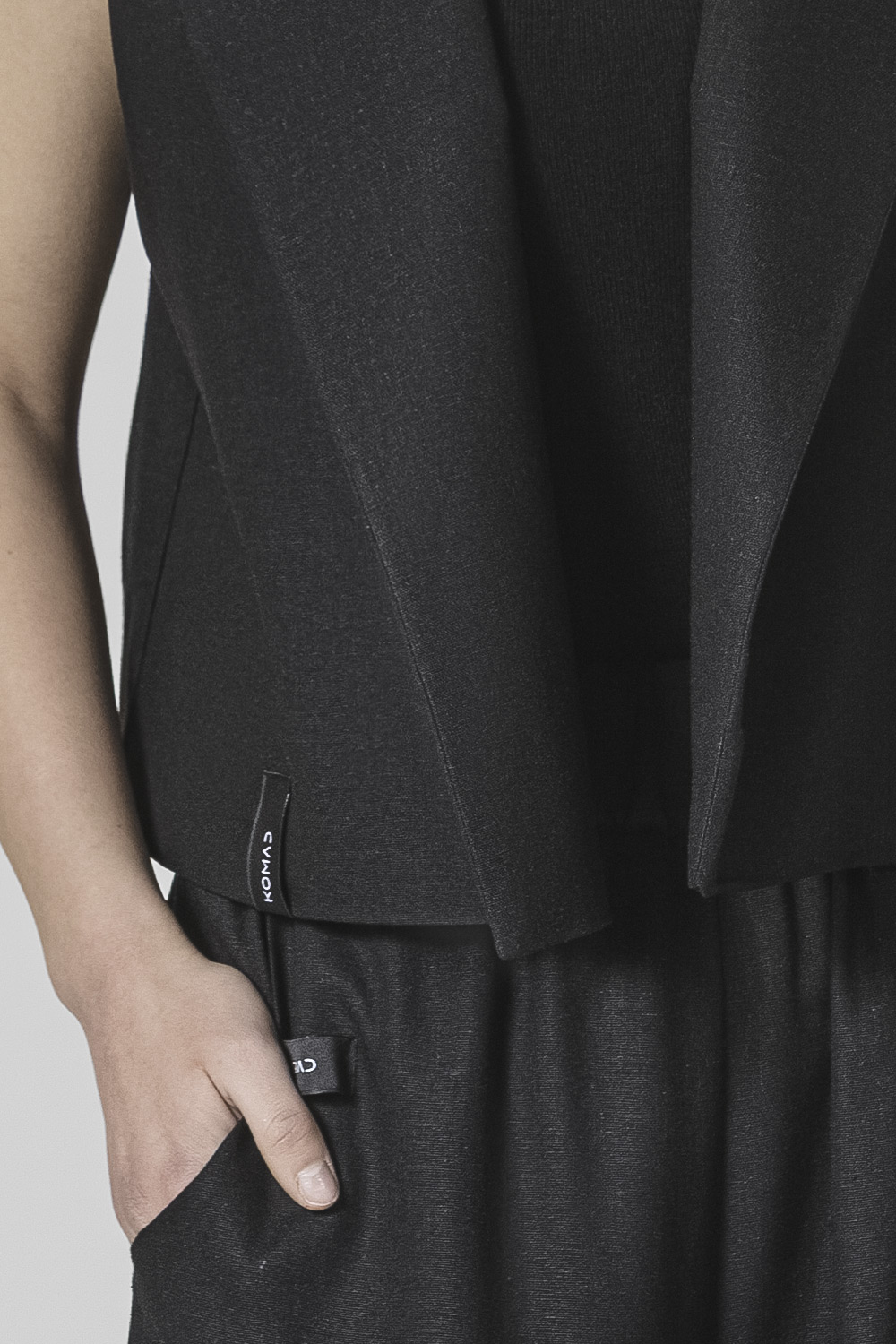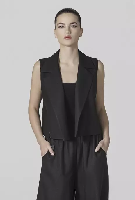 Open front waistcoat with wide notch lapel in black linen material.